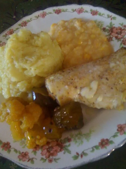 Then finished off siding the plate with canned cream corn and Sweet Pickles (with cauliflower.)