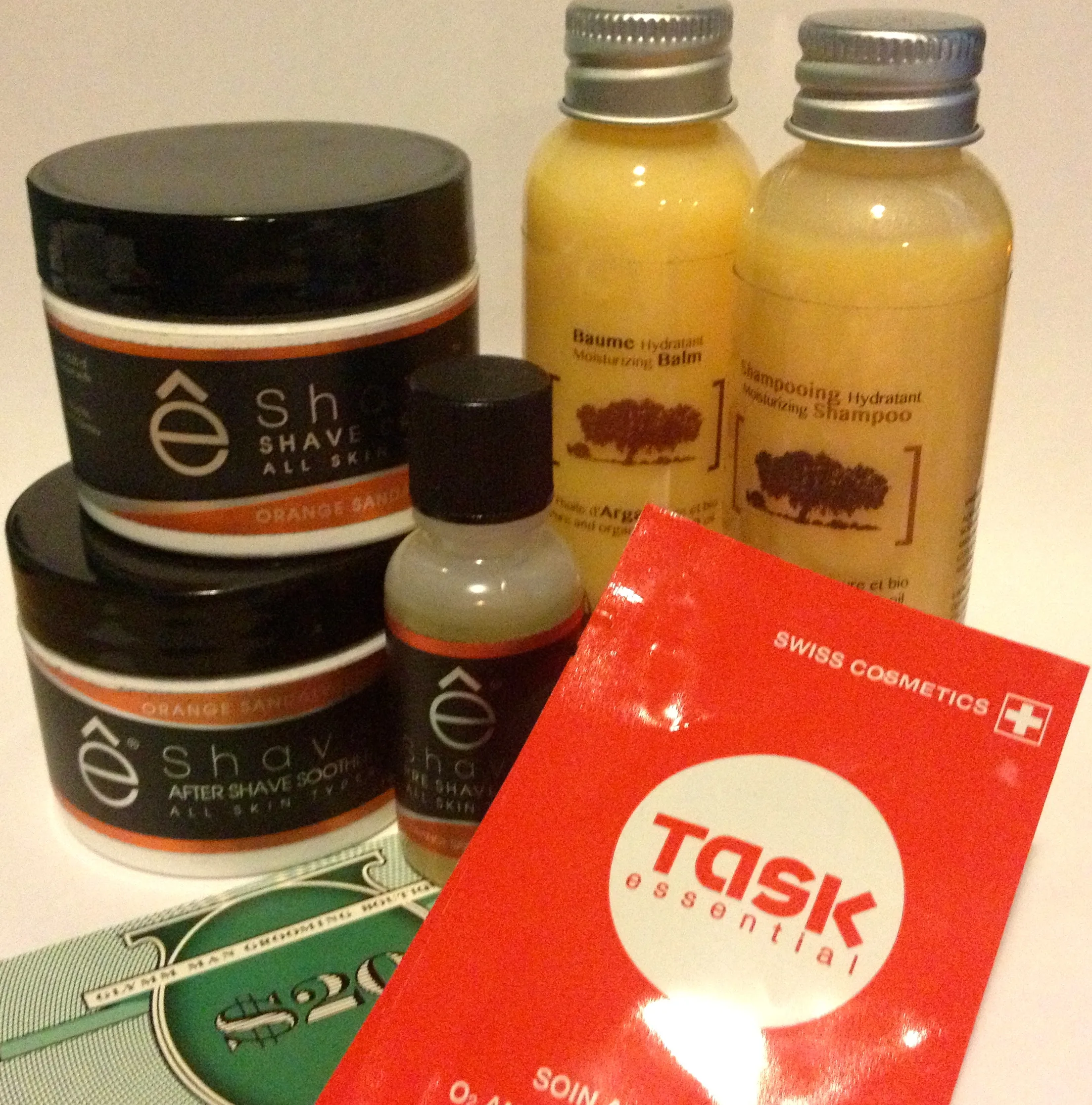 Most of the items were from a brand êshave a 15g bottle of pre-shave oil, a 30g container of shaving cream, and a 30g container of after shave cream. Then from Lys Parisien Professionnel, there was a 60ml bottle of moisturizing shampoo and, balm (Argan Oil conditioner). Then there was 2 2ml O2 Anti-ageing treatment.